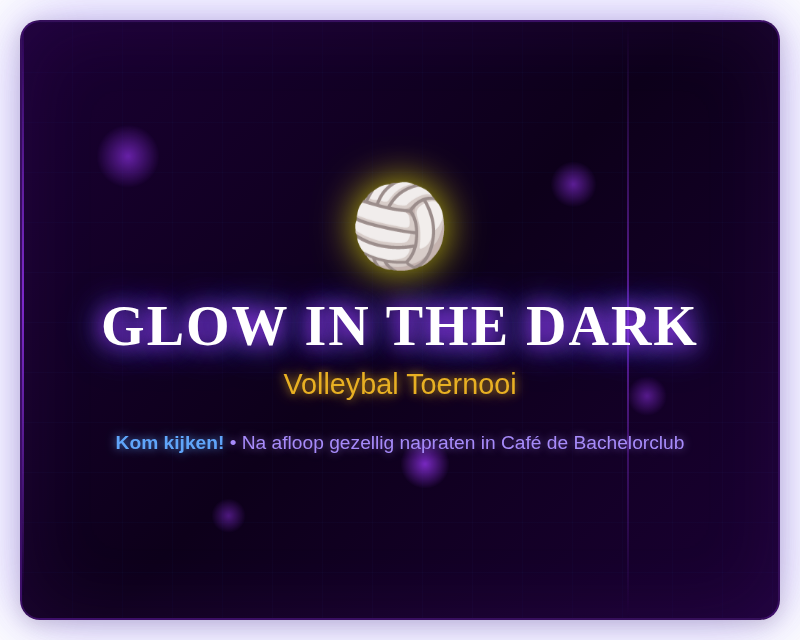 Het is bijna zover! Binnenkort organiseren we een spectaculair Glow in the Dark volleybaltoernooi in onze gymzaal. Een avond vol spannende wedstrijden onder ultraviolet licht, waarbij de ballen en lijnen oplichten in het donker.